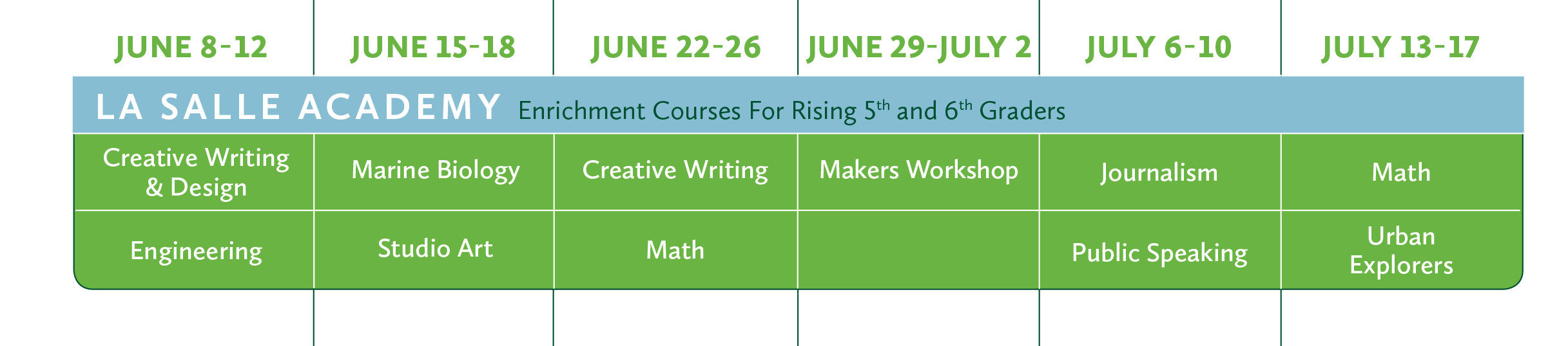 Calling all students and athletes ages 8—14! One-week summer enrichment courses and sports academies are just a click away. Courses run from June 8 to July 17. Visit the Summer Institute page today.
